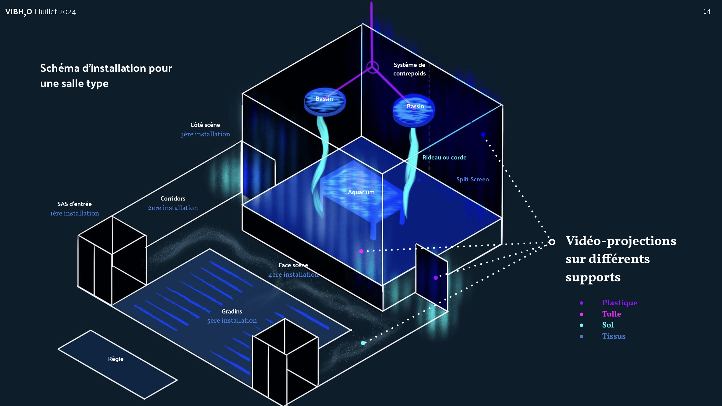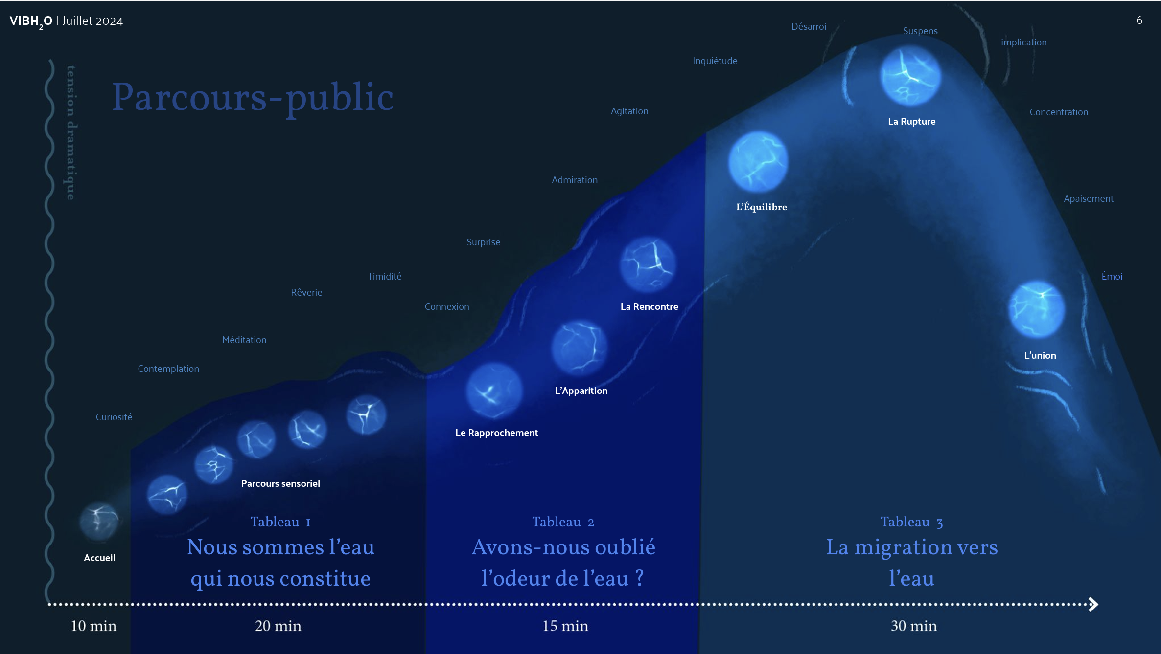 À travers son univers aquatique, l’expérience questionne notre rapport personnel à la molécule H₂O, pour ensuite élargir le champ du sujet vers des thématiques plus globales auxquelles nous sommes confrontés en tant que société.
